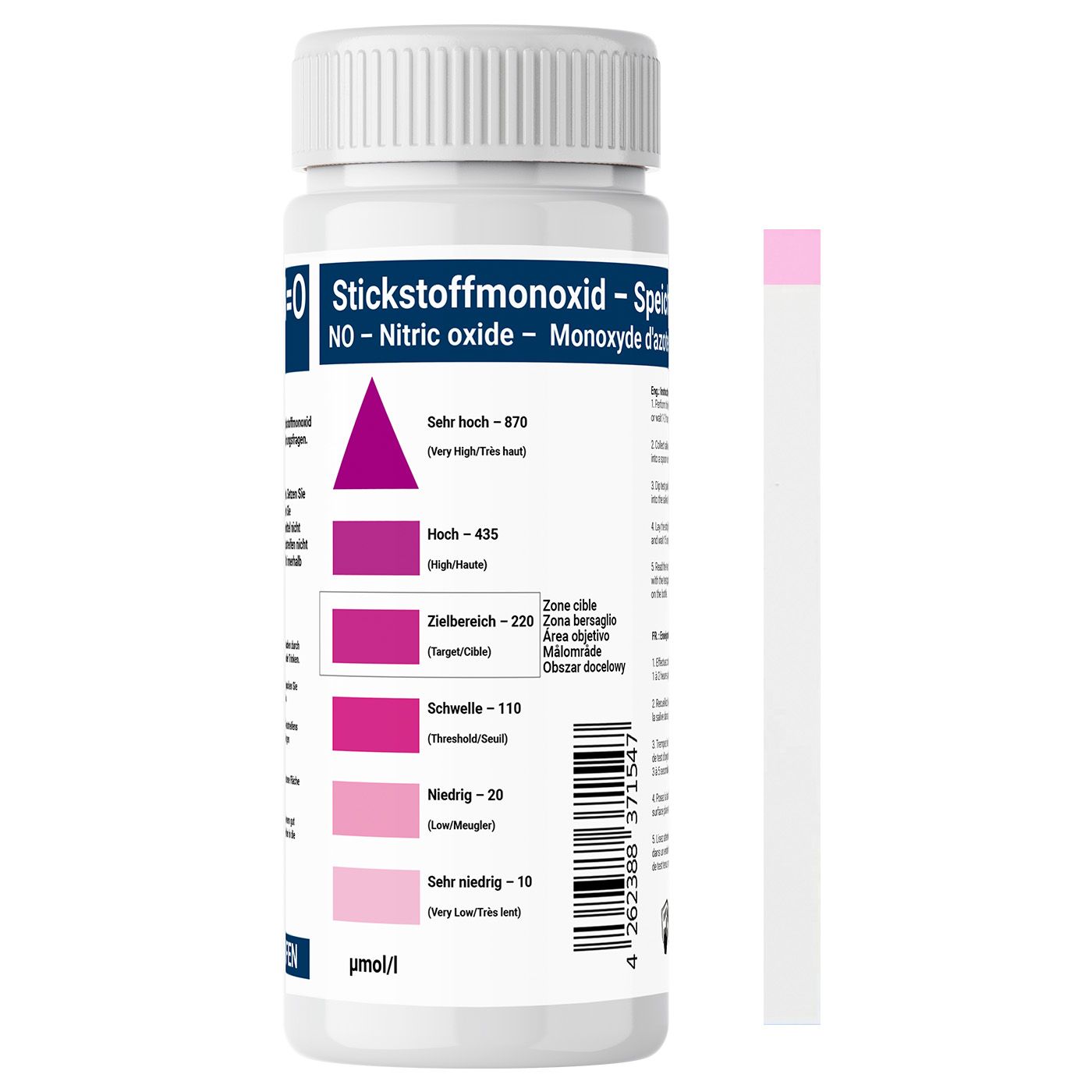 | Testprinzip | Enzymatischer Nachweis von Stickstoffmonoxid (NO) in Speichelproben. Die chemische Reaktion führt zu einer Farbänderung, die mit einer beiliegenden Farbskala verglichen wird. |