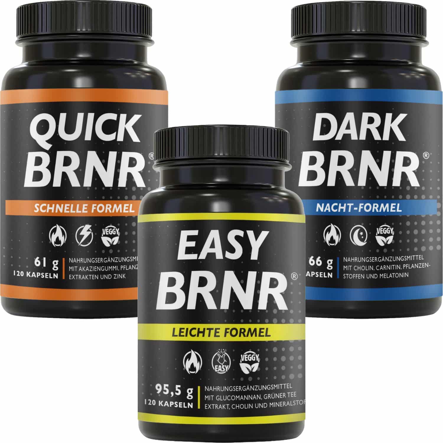 QUICK BRNR enthält typischerweise Pflanzenextrakte wie Grüntee und Guarana zur Stoffwechselanregung. DARK BRNR setzt auf Substanzen wie L-Carnitin und CLA zur Unterstützung der Fettverbrennung. EASY BRNR konzentriert sich auf Ballaststoffe und Verdauungsenzyme zur Förderung der Darmgesundheit und Stoffwechselbalance.