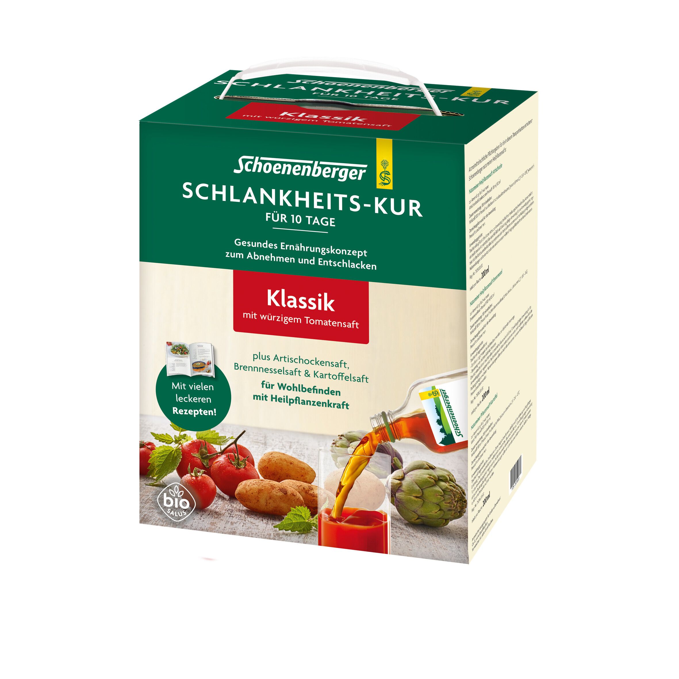 | Hauptinhaltsstoffe | Die Schlankheits-Kur Klassik basiert auf einer sorgfältig abgestimmten Komposition aus reinen Muttersäften von Heilpflanzen, die traditionell zur Gewichtsreduktion und Stoffwechselanregung eingesetzt werden. Dazu gehören unter anderem Extrakte aus Brennnessel, Orthosiphon, Mate, Gurkenkraut und Artischocke. |